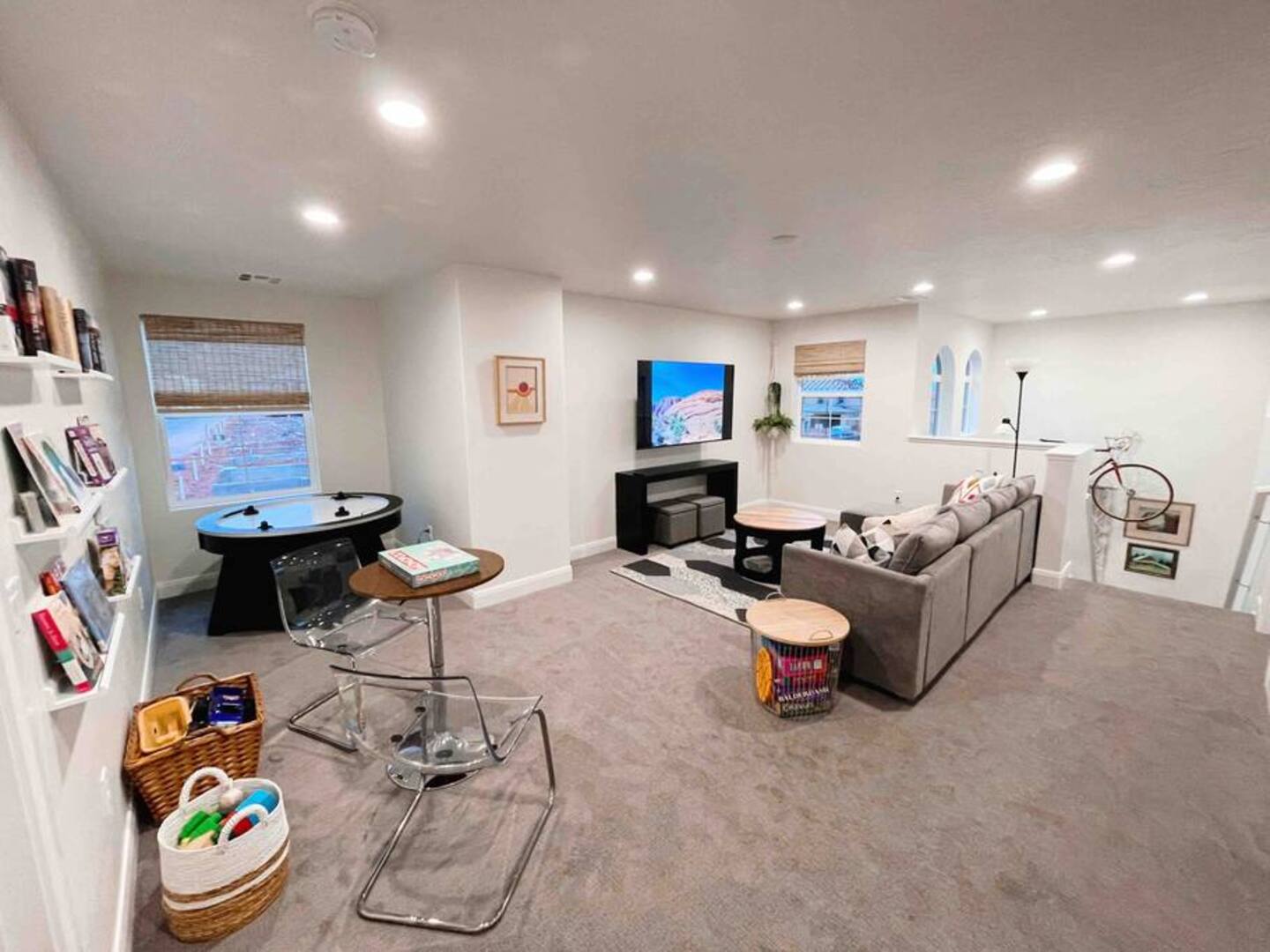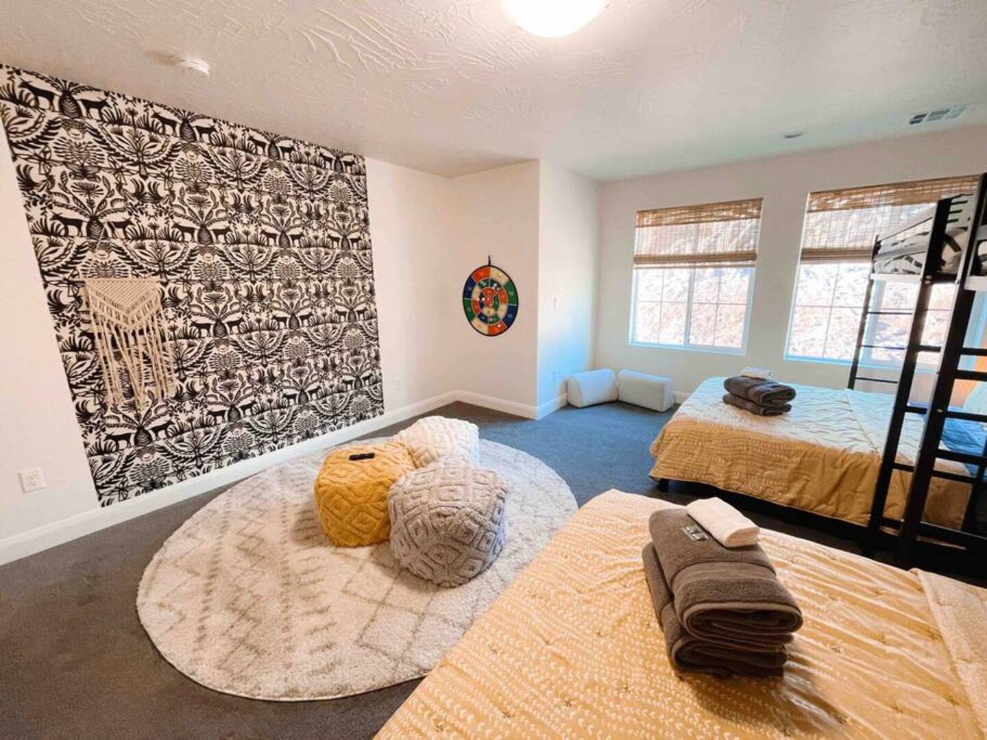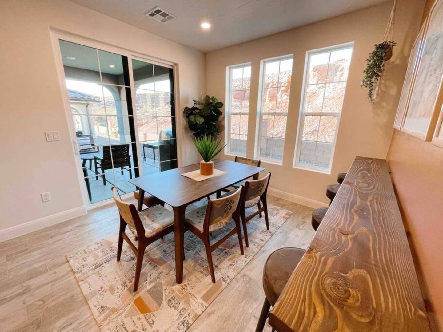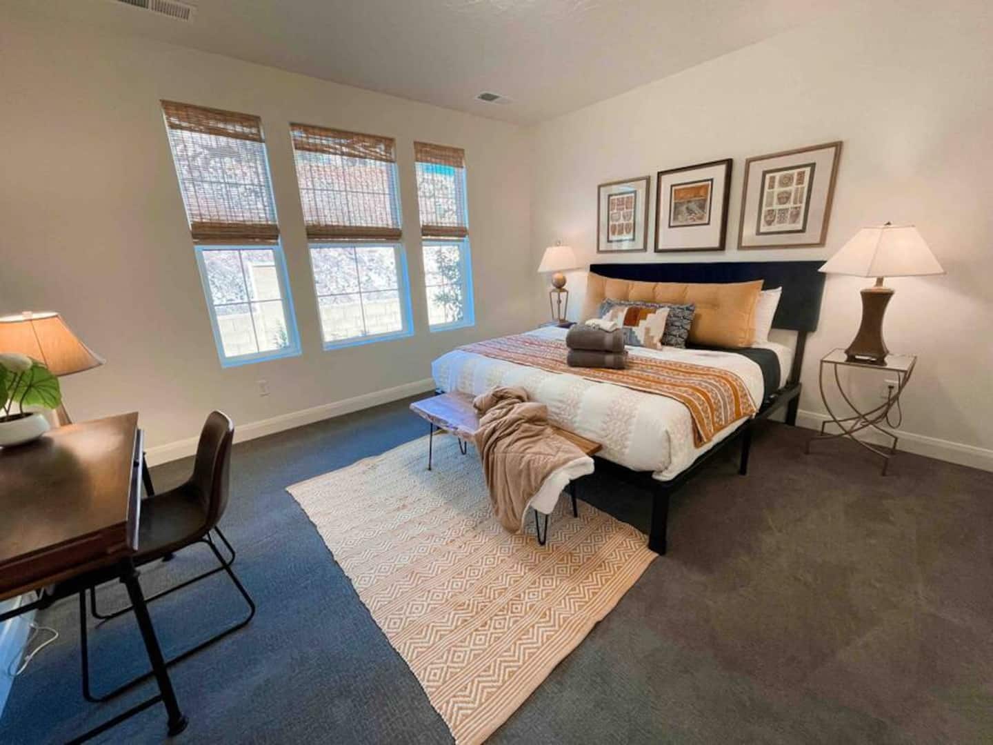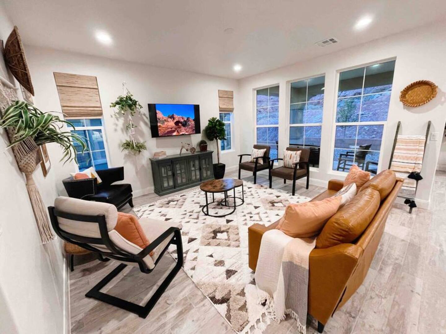 Experience the best of Southern Utah from the comfort of this townhome. Bicycle Boho near Zion's 2600 square feet boast 5 beds and 5 baths, first floor king suite and living space, a separate loft upstairs with air hockey, a reading nook, and smart TV. EV-ready. Hang out at our lazy river, pool, hot tub or splash pad with the whole family. Centrally located to Zion National Park, championship golf courses, miles of hiking and biking trails, Sand Hollow, Snow Canyon, and downtown St. George.