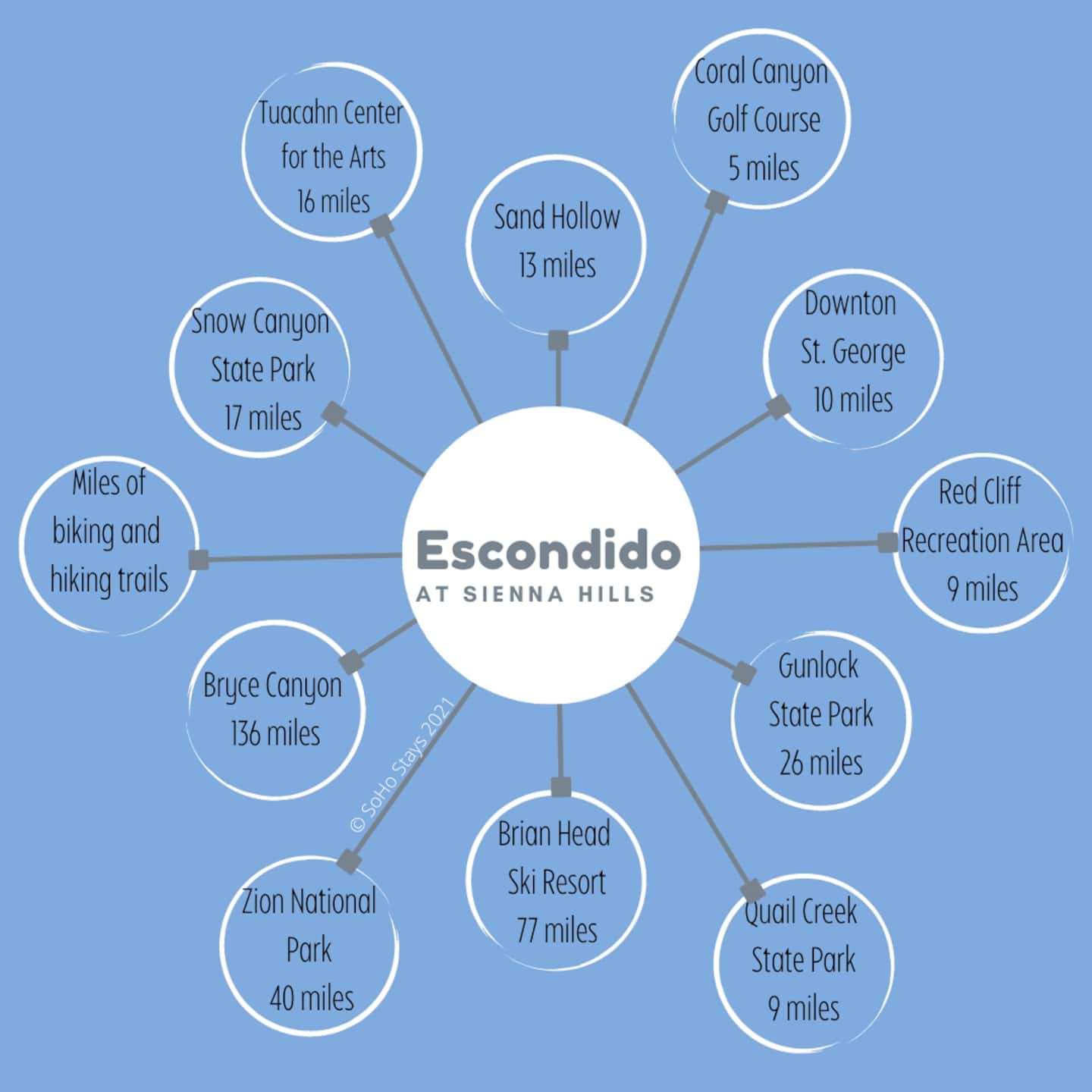 We are nestled in the picturesque red rocks of Southern Utah. Our resort style neighborhood offers a lazy river, pool with a water slide, 2 hot tubs, a splash pad, and 2 pickle ball courts. We are centrally located between all the attractions Southern Utah has to offer. When you feel like heading into town, downtown St. George is 10 minutes away by car to enjoy fine eateries and shopping. Looking for something to do after dinner, catch a live performance at Tuacahn Center for the Arts which is only 20 minutes away. Feeling adventurous? Book an organized side-by-side tour through the red rocks and sand dunes at Sand Hollow. Estimated Travel Times: Sand Hollow State Park – 20 minute drive Zion National Park – 45 minute drive Toquerville Falls – 20 minute drive Bryce Canyon National Park – 2 hour drive Gunlock State Park – 40 minute drive Snow Canyon State Park – 20 minute drive Quail Creek State Park – 15 minute drive