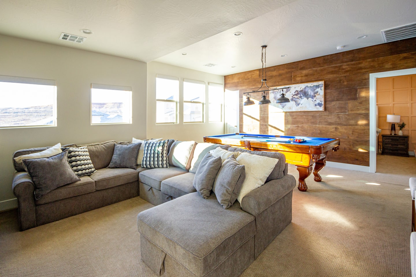 The expansive living areas provide plenty of room for gathering, while a fully equipped kitchen makes meal preparation a breeze. Fun-filled amenities like a game room with a pool table, a ping pong table, and a kids' playroom ensure entertainment for all ages.