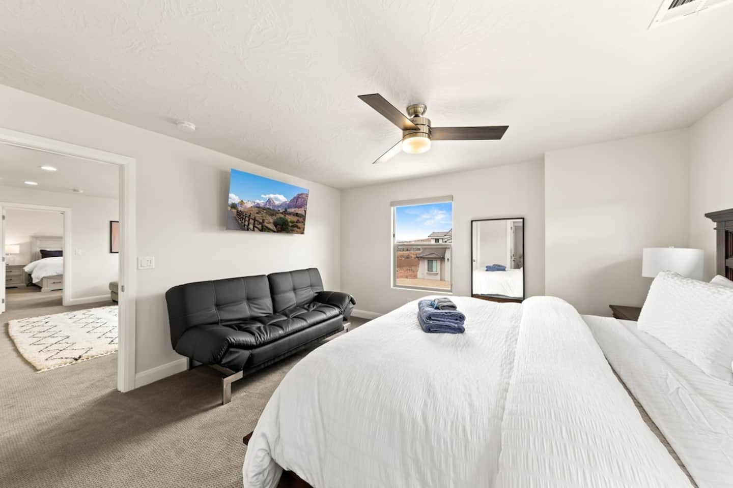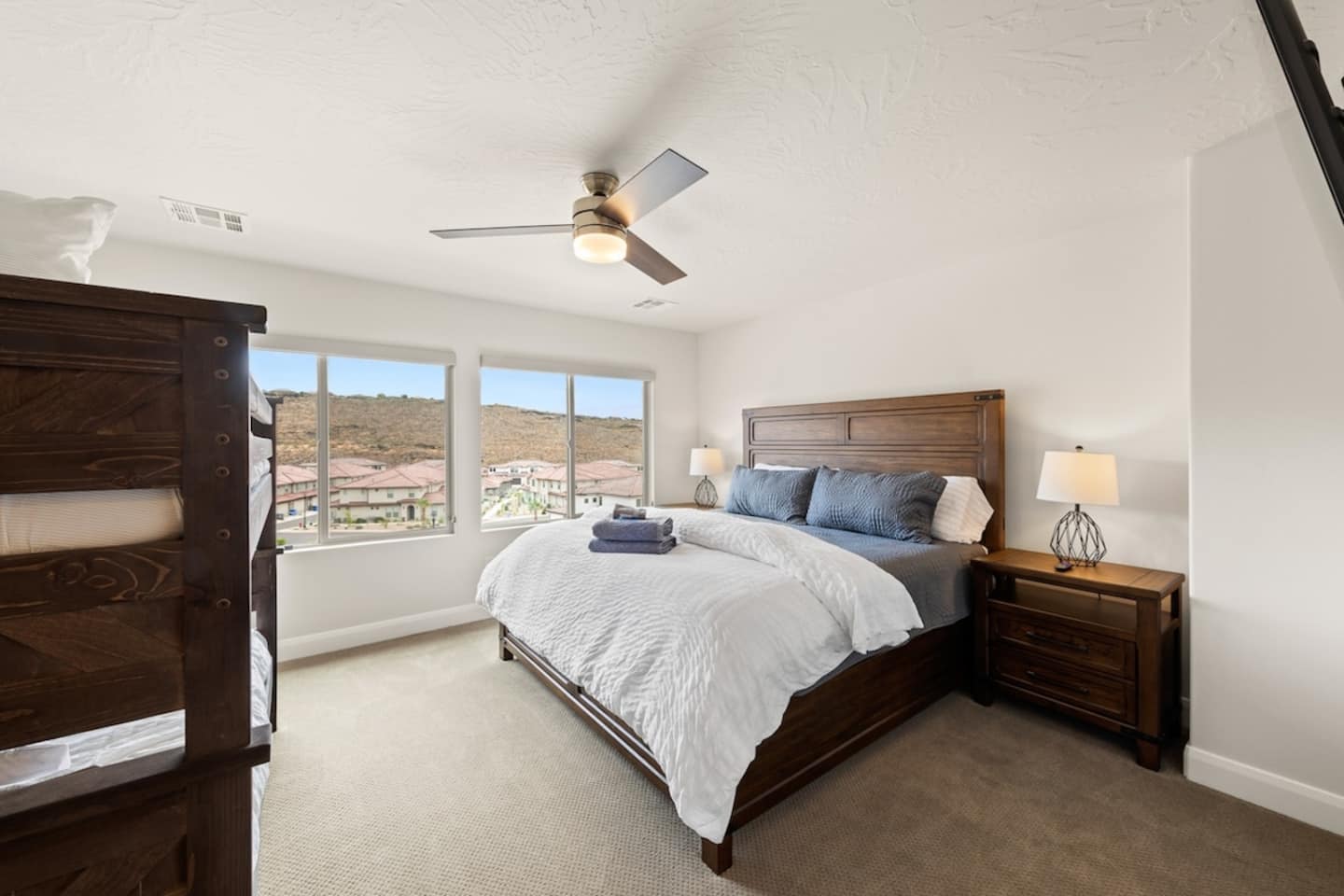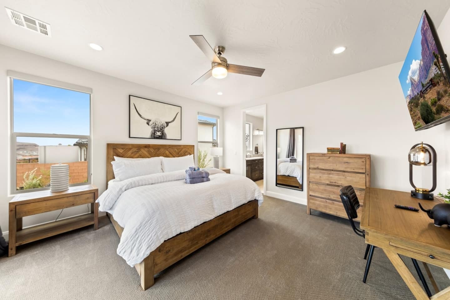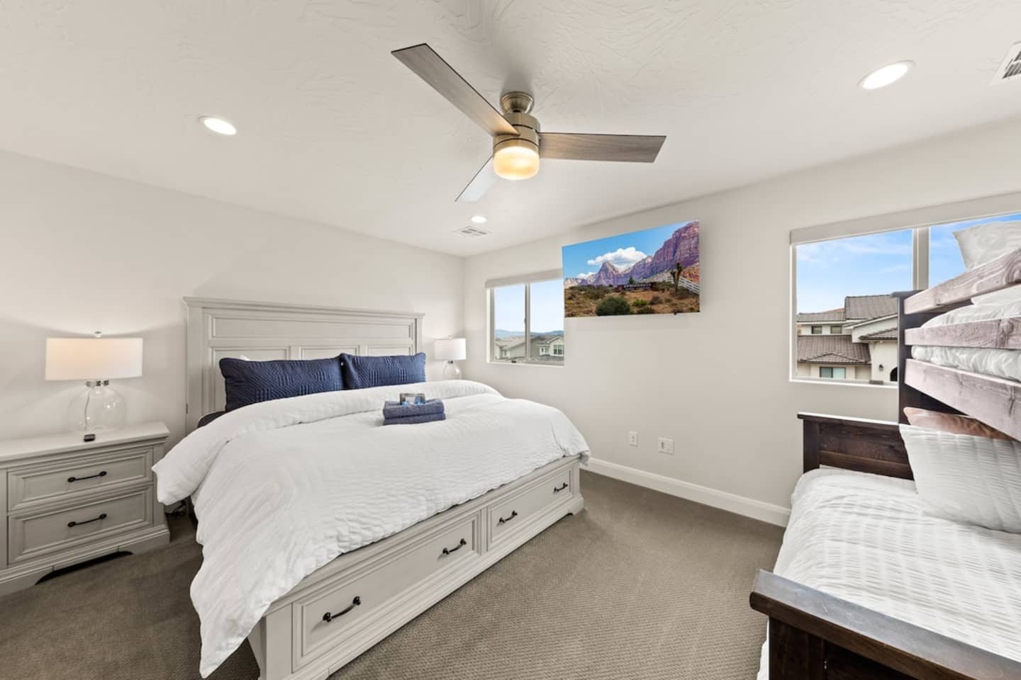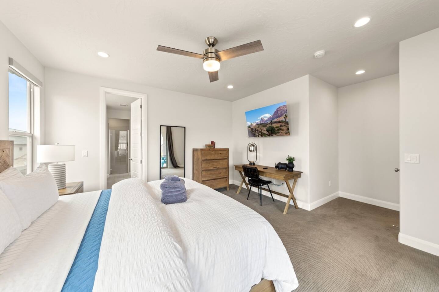 We are nestled in the picturesque red rocks of Southern Utah. Our resort style neighborhood offers a lazy river, pool with a water slide, 2 hot tubs, a splash pad, and 2 pickle ball courts. We are centrally located between all the attractions Southern Utah has to offer. Relax on the back patio and enjoy the beautiful Utah Desert view When you feel like heading into town, downtown St. George is 10 minutes away by car to enjoy fine eateries and shopping. Looking for something to do after dinner, catch a live performance at Tuacahn Center for the Arts which is only 20 minutes away. Feeling adventurous? Book an organized side-by-side tour through the red rocks and sand dunes at Sand Hollow. Estimated Travel Times: Sand Hollow State Park – 20 minute drive Zion National Park – 45 minute drive Toquerville Falls – 20 minute drive Bryce Canyon National Park – 2 hour drive Gunlock State Park – 40 minute drive Snow Canyon State Park – 20 minute drive Quail Creek State Park – 15 minute drive