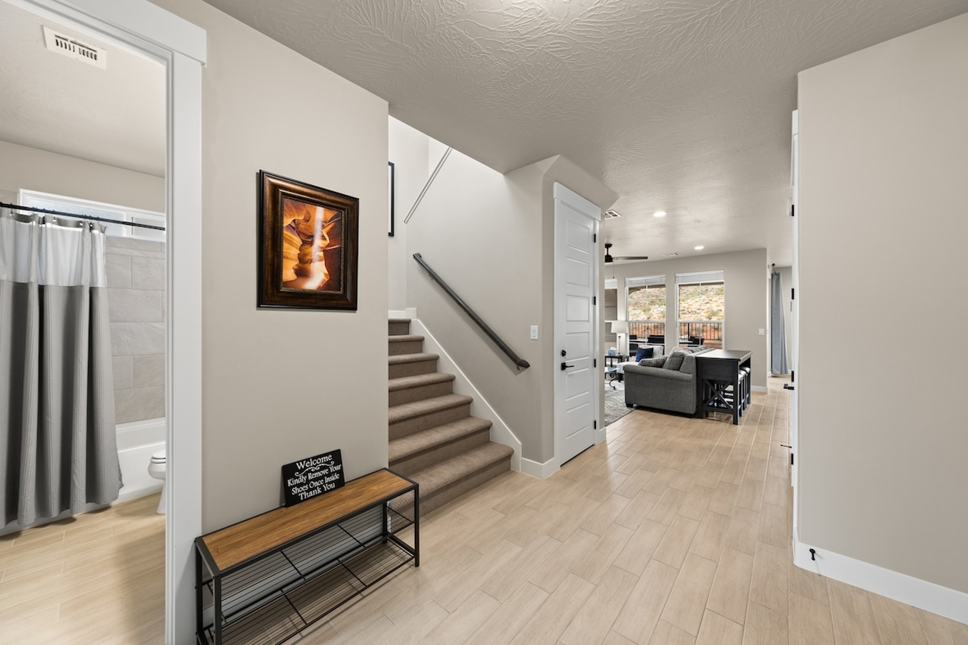 We are nestled in the picturesque red rocks of Southern Utah. Our resort style neighborhood offers a lazy river, pool with a water slide, 2 hot tubs, a splash pad, and 2 pickle ball courts. We are centrally located between all the attractions Southern Utah has to offer. When you feel like heading into town, downtown St. George is 10 minutes away by car to enjoy fine eateries and shopping. Looking for something to do after dinner, catch a live performance at Tuacahn Center for the Arts which is only 20 minutes away. Feeling adventurous? Book an organized side-by-side tour through the red rocks and sand dunes at Sand Hollow. Estimated Travel Times: Sand Hollow State Park – 20 minute drive Zion National Park – 45 minute drive Toquerville Falls – 20 minute drive Bryce Canyon National Park – 2 hour drive Gunlock State Park – 40 minute drive Snow Canyon State Park – 20 minute drive Quail Creek State Park – 15 minute drive