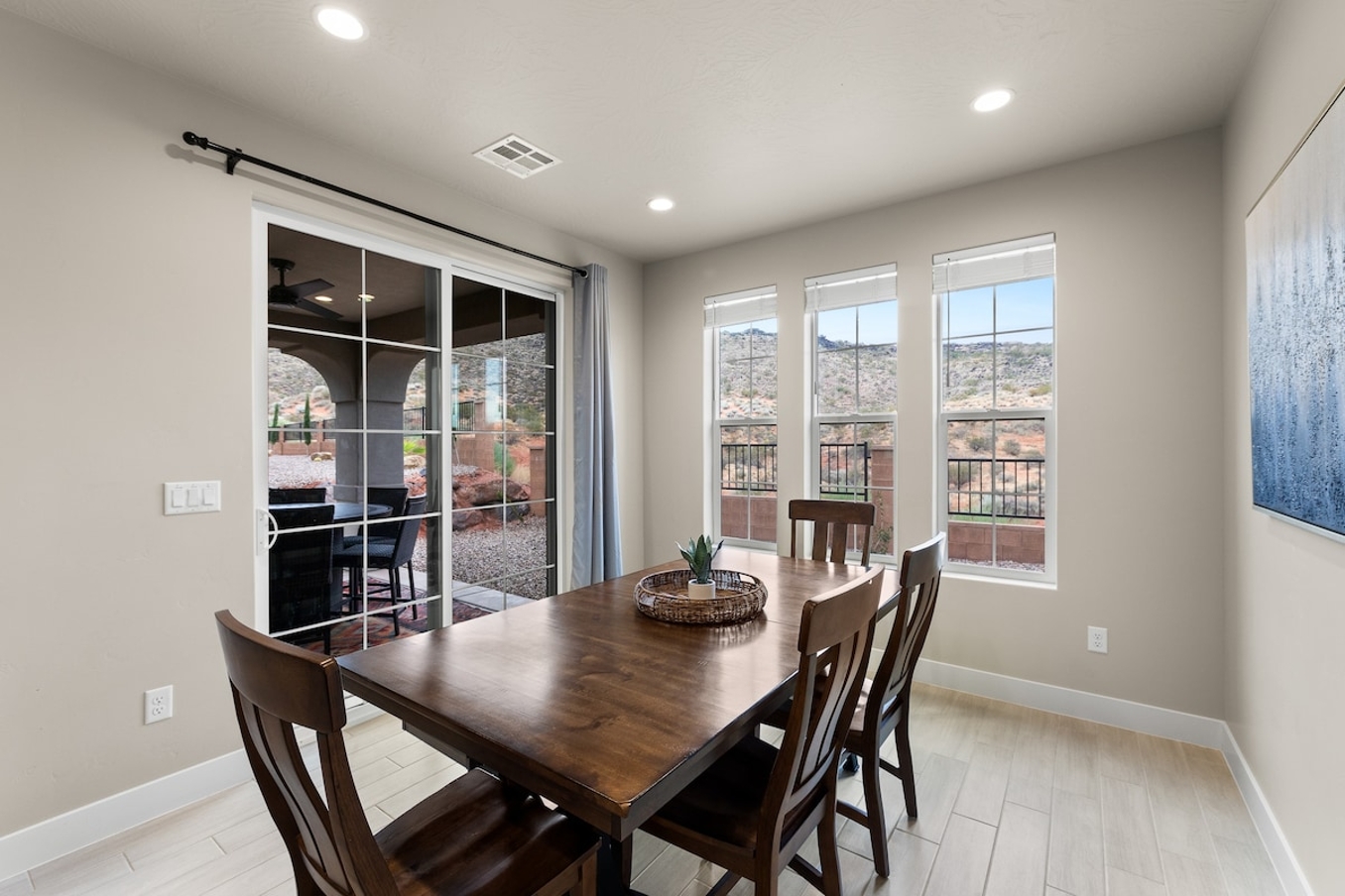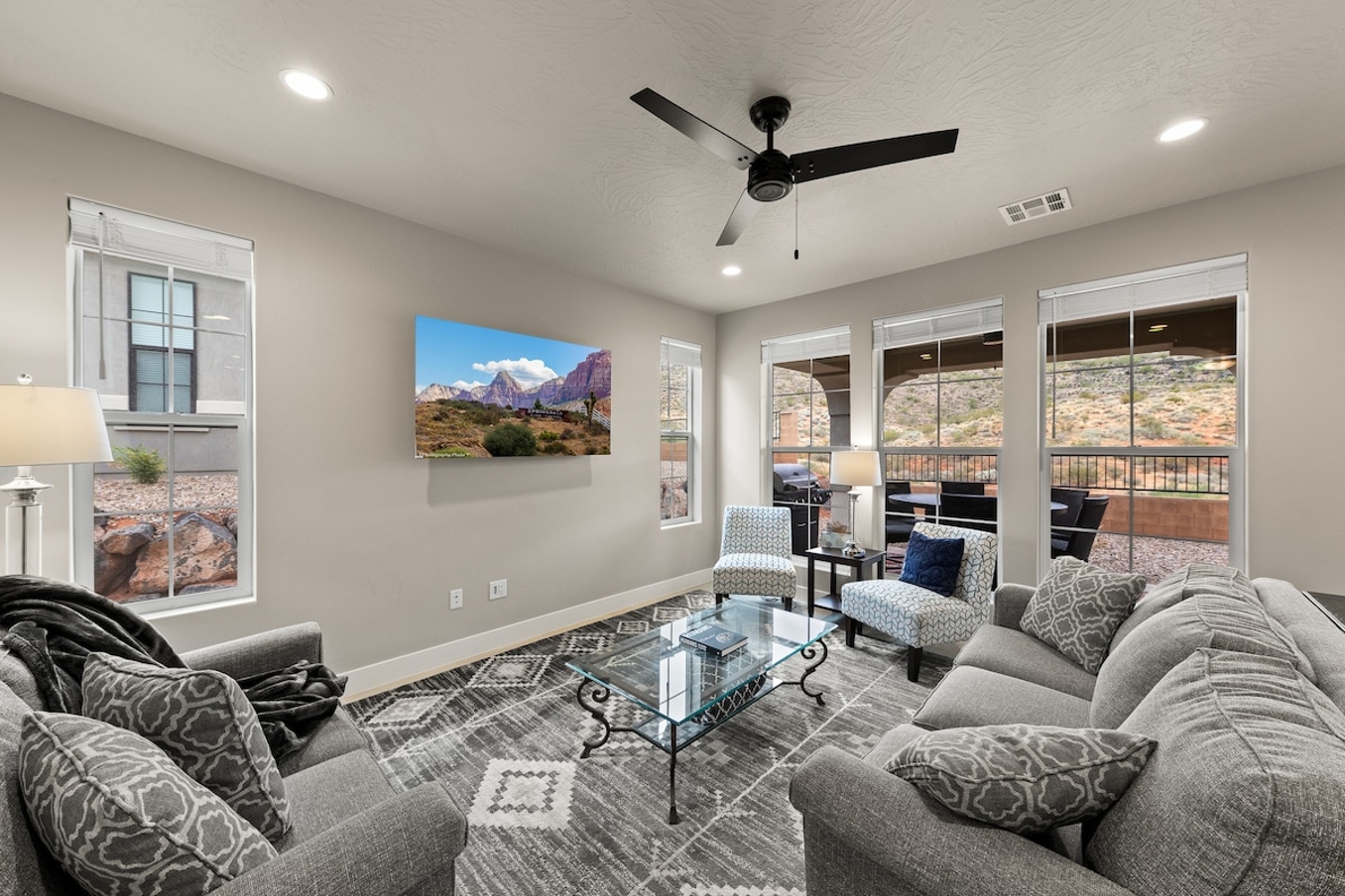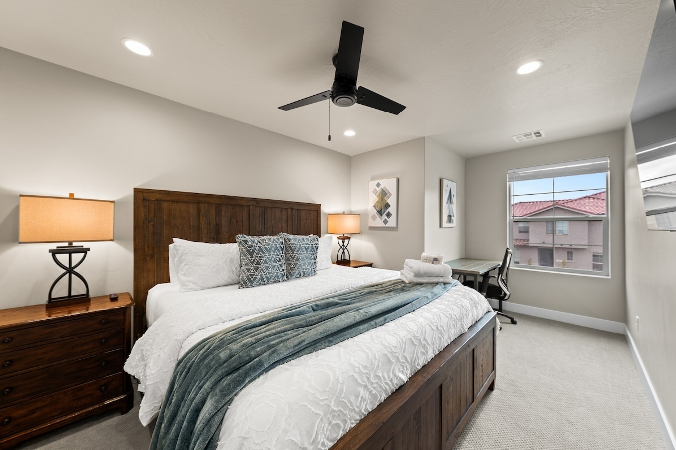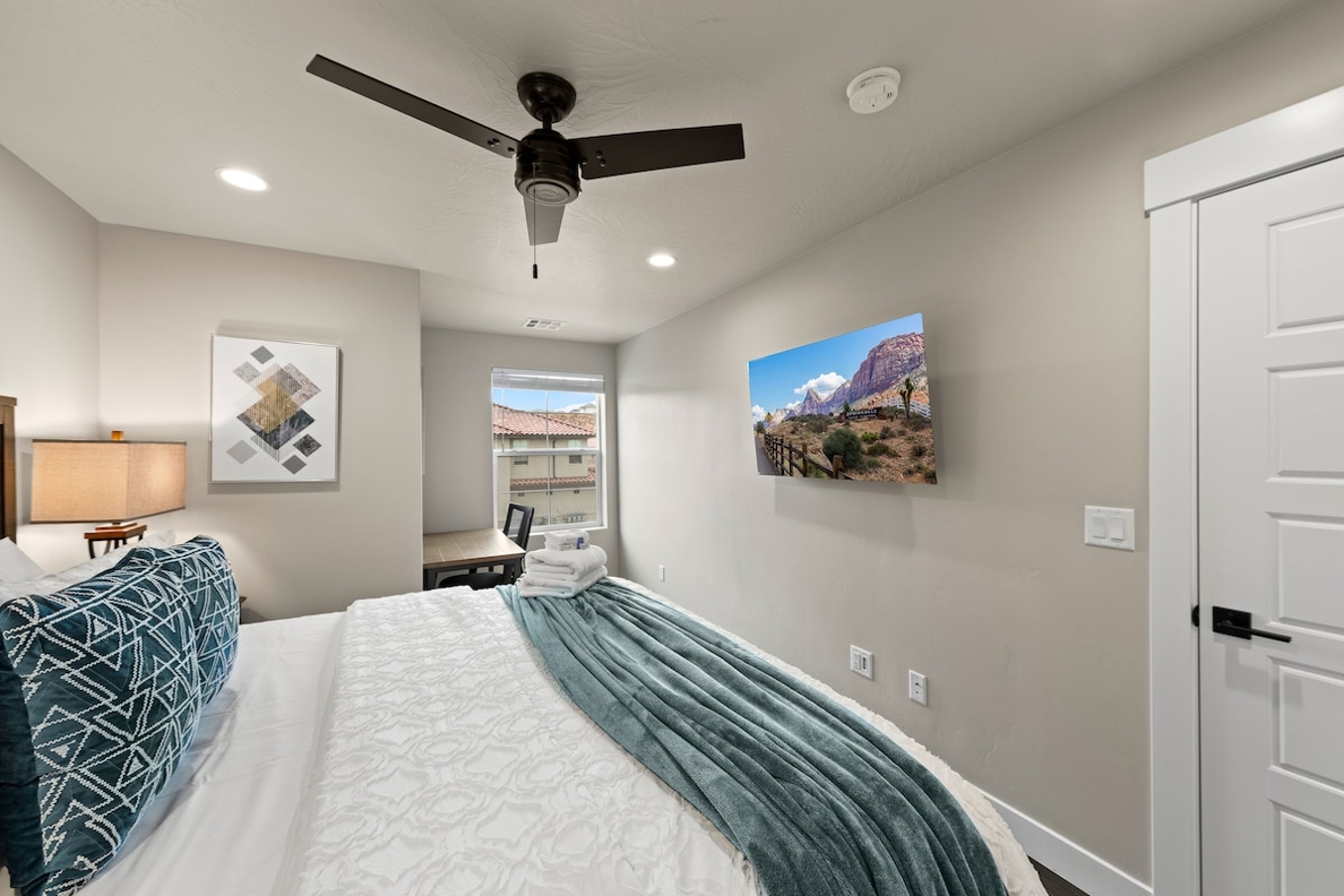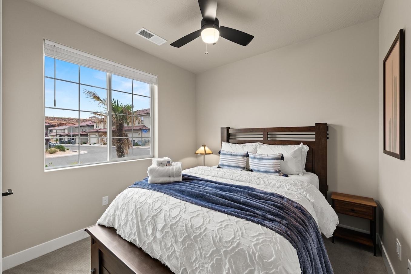 Experience the best of Southern Utah from the comfort of this townhome. This home boasts first floor living, a patio with a desert ravine view, 3 king suites, wheel chair accessible bathroom, 5 en-suite bathrooms, two living spaces, fiber wifi, and a board game collection. Enjoy our lazy river, pool, hot tub, splash pad, or play pickleball with the whole family! Centrally located to Zion National Park, championship golf courses, miles of hiking and biking trails, downtown St. George. EV-ready.