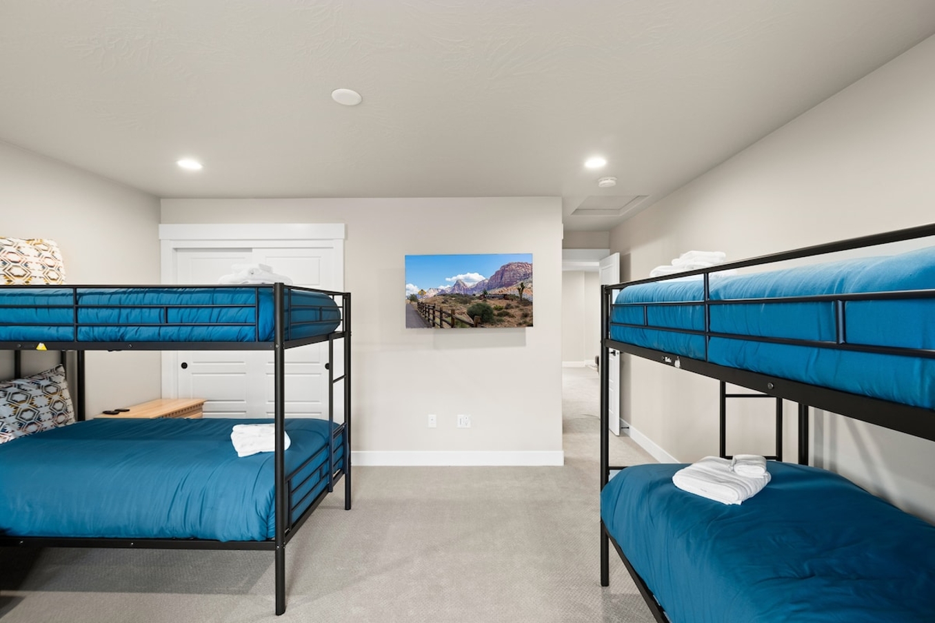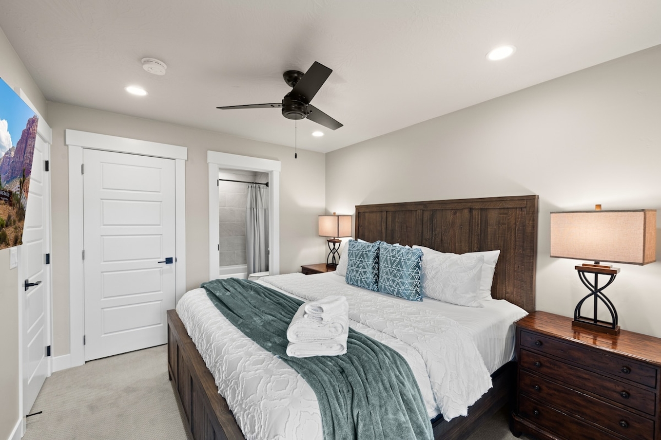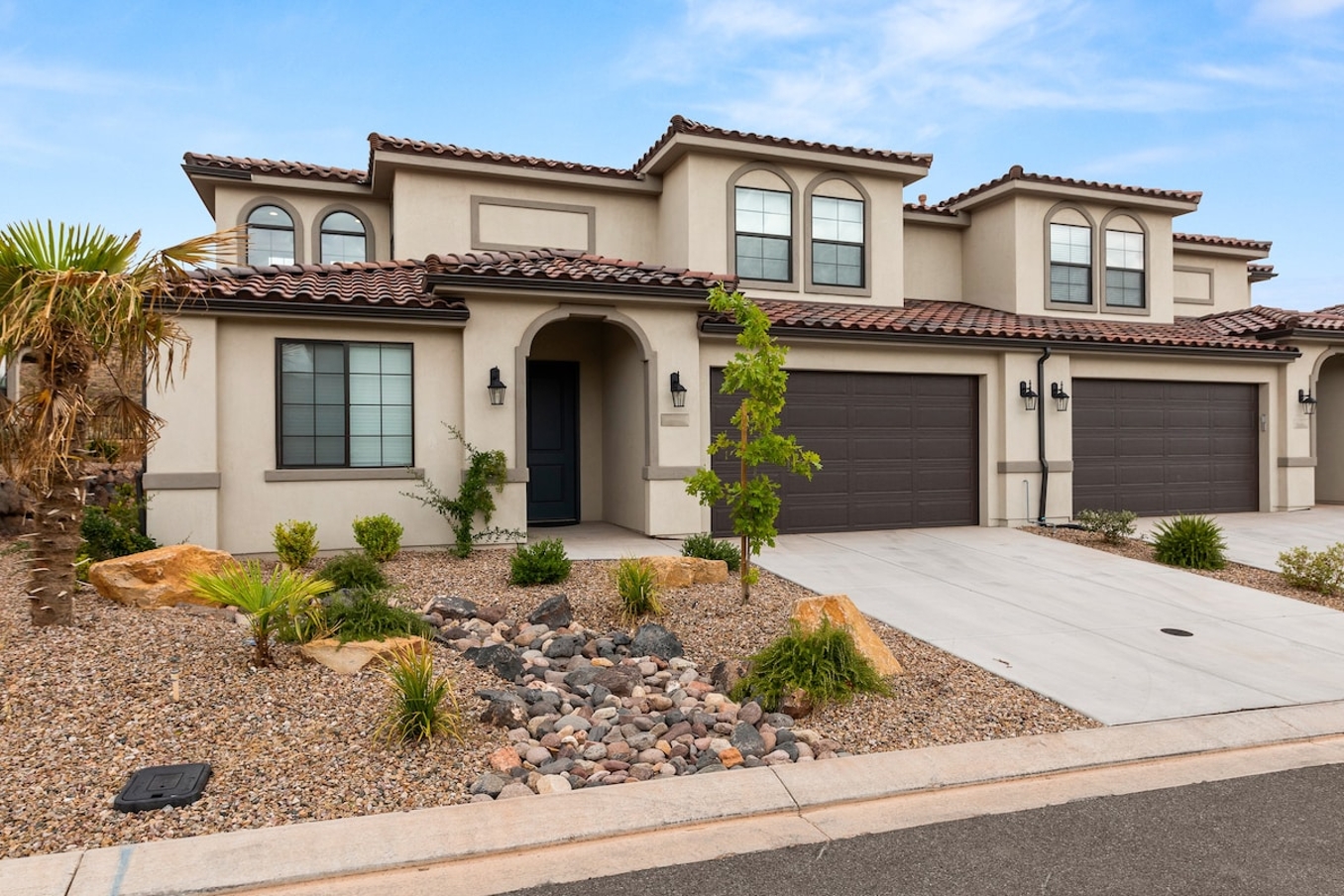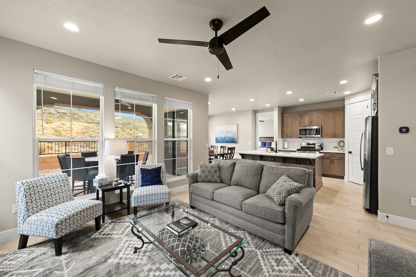 Experience the best of Southern Utah from the comfort of this townhome. This home boasts first floor living, a patio with a desert ravine view, 3 king suites, wheel chair accessible bathroom, 5 en-suite bathrooms, two living spaces, fiber wifi, and a board game collection. Enjoy our lazy river, pool, hot tub, splash pad, or play pickleball with the whole family! Centrally located to Zion National Park, championship golf courses, miles of hiking and biking trails, downtown St. George. EV-ready.