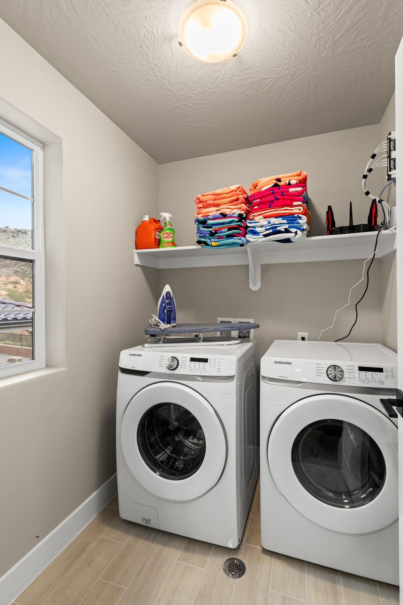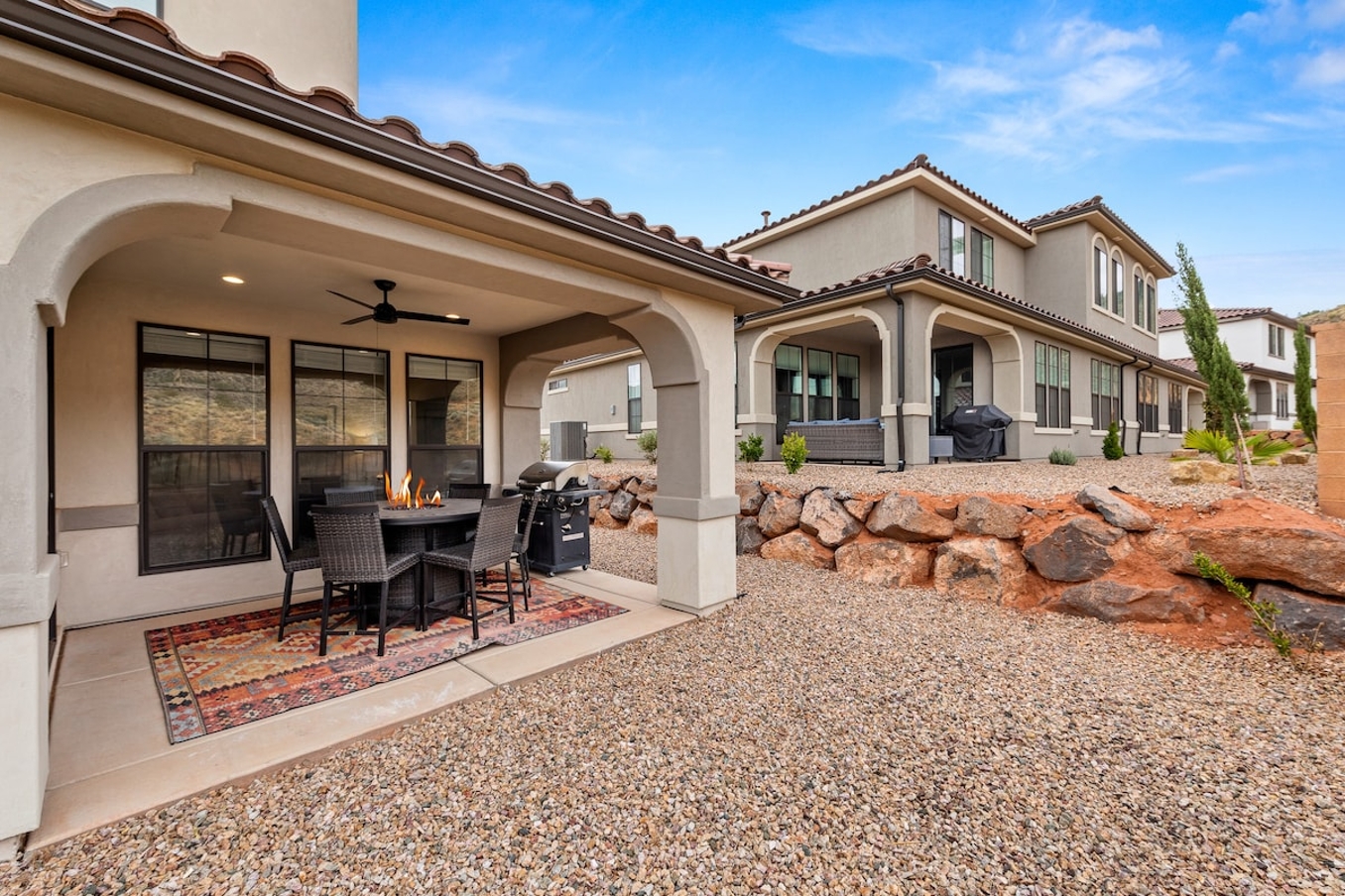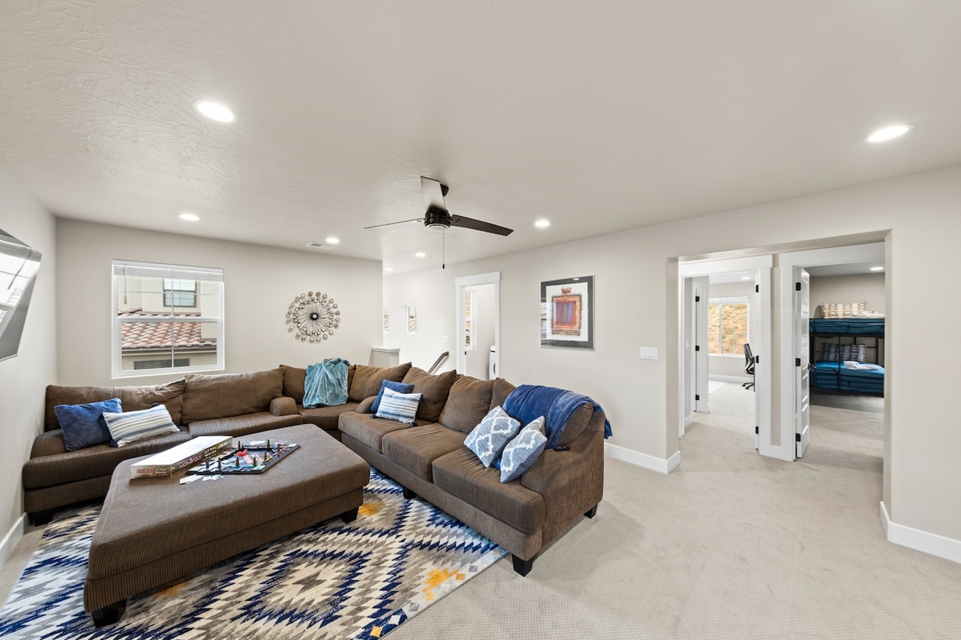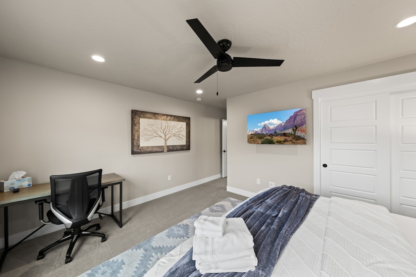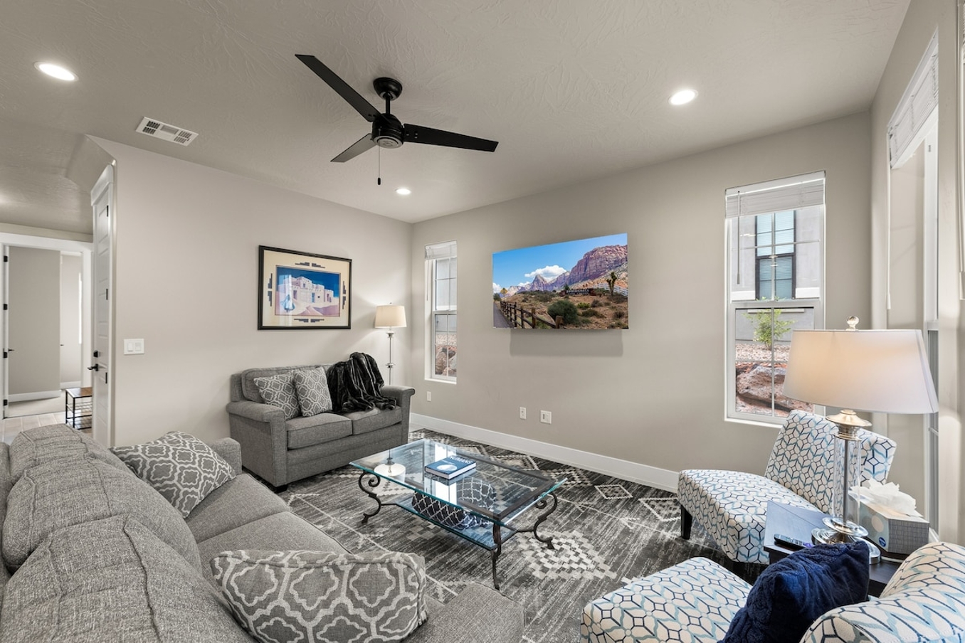 Experience the best of Southern Utah from the comfort of this townhome. This home boasts first floor living, a patio with a desert ravine view, 3 king suites, wheel chair accessible bathroom, 5 en-suite bathrooms, two living spaces, fiber wifi, and a board game collection. Enjoy our lazy river, pool, hot tub, splash pad, or play pickleball with the whole family! Centrally located to Zion National Park, championship golf courses, miles of hiking and biking trails, downtown St. George. EV-ready.