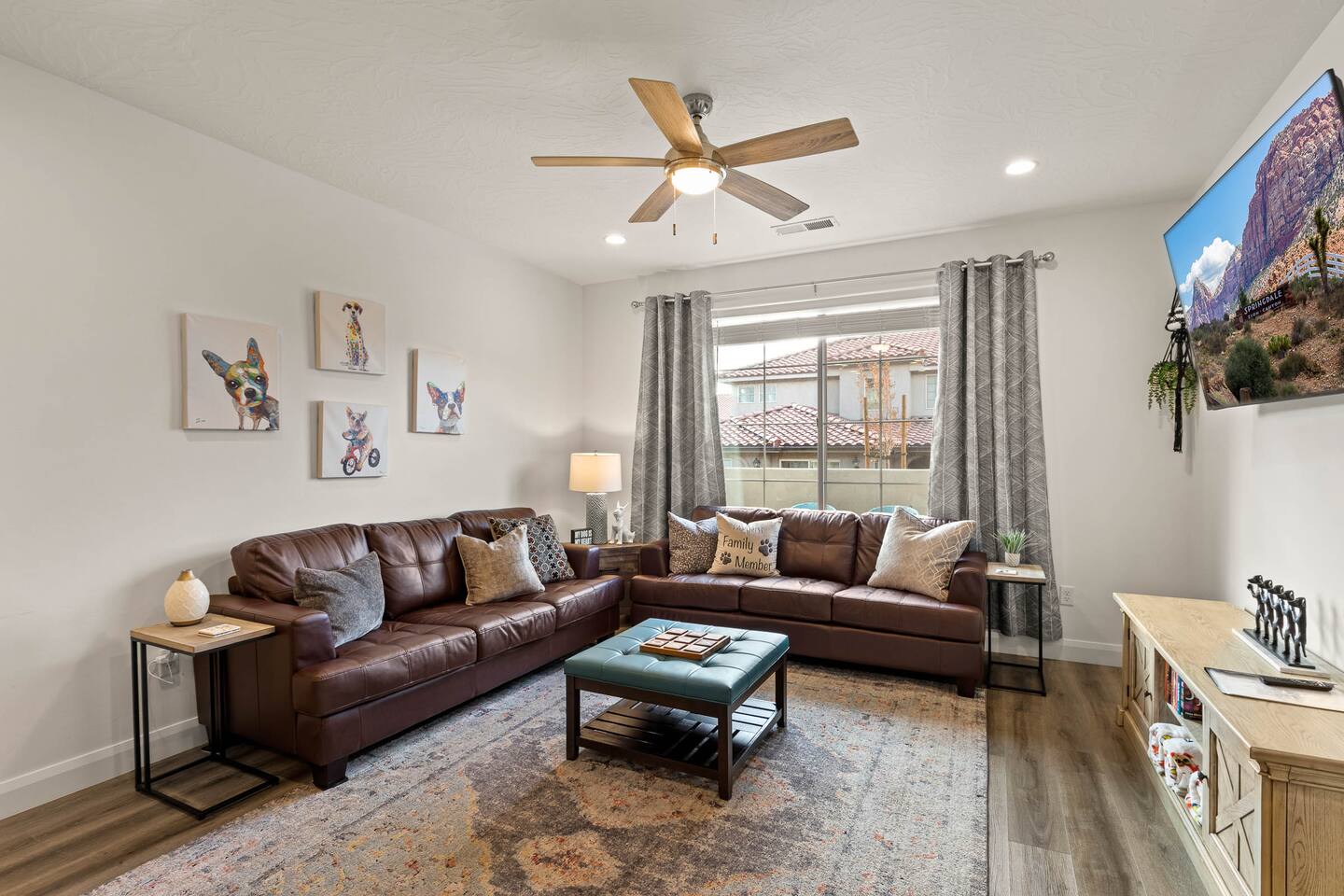 We are nestled in the picturesque red rocks of Southern Utah. Our resort style neighborhood offers a lazy river, pool with a water slide, 2 hot tubs, a splash pad, and 2 pickle ball courts. We are centrally located between all the attractions Southern Utah has to offer. When you feel like heading into town, downtown St. George is 10 minutes away by car to enjoy fine eateries and shopping. Looking for something to do after dinner, catch a live performance at Tuacahn Center for the Arts which is only 20 minutes away. Feeling adventurous? Book an organized side-by-side tour through the red rocks and sand dunes at Sand Hollow. Estimated Travel Times: Sand Hollow State Park – 20 minute drive Zion National Park – 45 minute drive Toquerville Falls – 20 minute drive Bryce Canyon National Park – 2 hour drive Gunlock State Park – 40 minute drive Snow Canyon State Park – 20 minute drive Quail Creek State Park – 15 minute drive